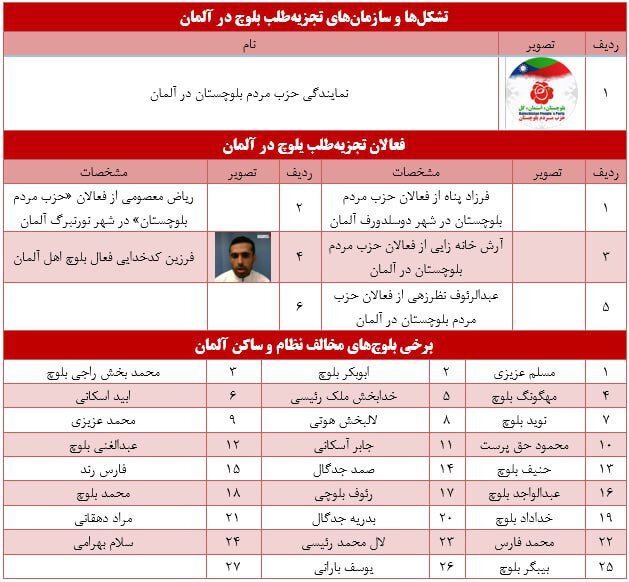 حزب تجزیه‌طلب بلوچستان (بلوچستانءِ اُستمانءِ گل) با مرکزیت لندن و رهبری برخی چهره‌های سرشناس همچون رحیم بندویی و ناصر بلیده‌ای و گروهک الاحوازیه با مرکزیت سوئد و دانمارک دارای هوادارانی در آلمان هستند.