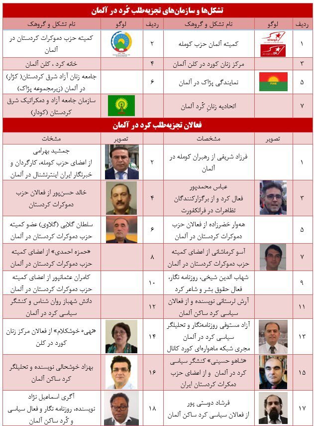 به گزارش انجمن بی تاوان،‌ براساس اطلاعات منتشر شده در فضای مجازی مشخص شد از گروه‌های تجزیه‌طلب کرد، گروهک‌هایی همچون حزب منحله دموکرات کردستان (حدکا)، گروه حیات آزاد کردستان(پژاک)، گروه کارگران کردستان ترکیه(پ.ک.ک)، سازمان کردستان کمونیست (گروه کومله)، سازمان جامعه آزاد و دمکراتیک شرق کردستان (کودار)، شاخه زنان گروه موسوم به یگان‌های مدافع خلق سوریه (YPJ) و… در آلمان فعالیت دارند.