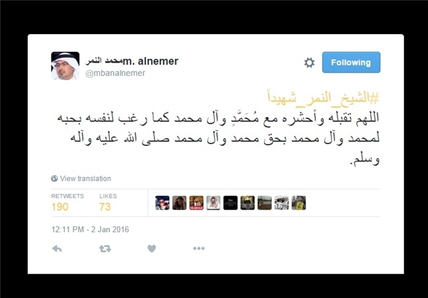 برادر شیخ نمر در صفحه توییتر خود با انتشار توییتی نوشت:
